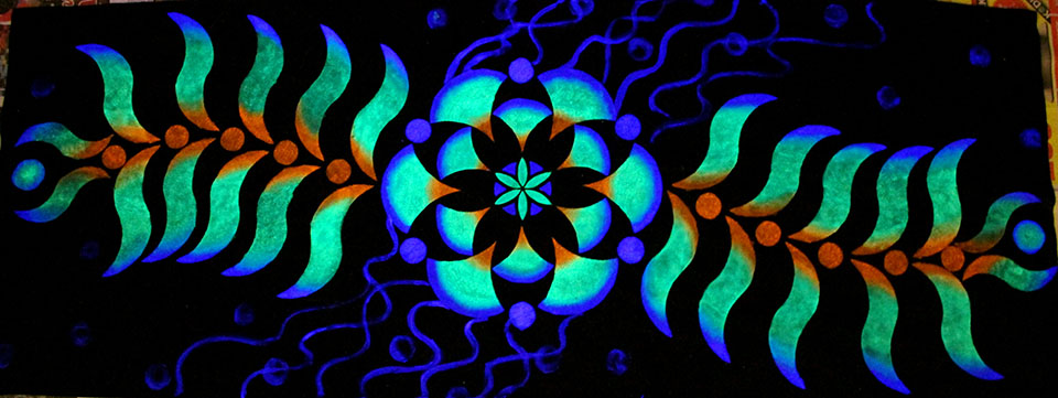 Uv-valossa hohtava seinäkangas, painettu sapluunoilla